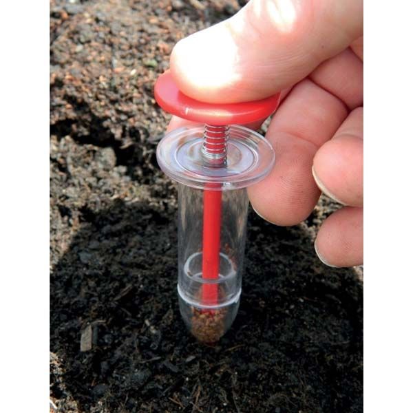 Rimuovere il tappo terminale e riempire il gambo principale con i semi secondo necessità. Richiudere il tappo, posizionarlo sul compost/terreno e premere lo stantuffo rosso per iniettare i semi nel compost/terreno. Seguire le istruzioni riportate sulla confezione dei semi per quanto riguarda la spaziatura necessaria.
